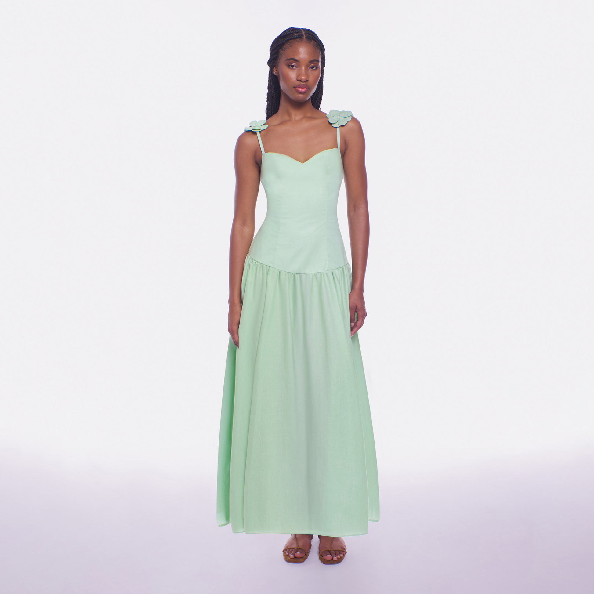 The Audrey Maxi Dress is a stunning expression of feminine elegance. Designed with a soft sweetheart neckline and a fitted drop waist that flows into a beautifully flared skirt, this silhouette moves with effortless grace. Oversized floral detailing at the straps adds a romantic, statement finish, elevating the look with delicate charm. Finished in a soft, pastel summer green, Audrey is versatile and timeless and is perfect for celebratory occasions such as showers and birthdays, while also serving as a quintessential resort style dress for elegant nights away.