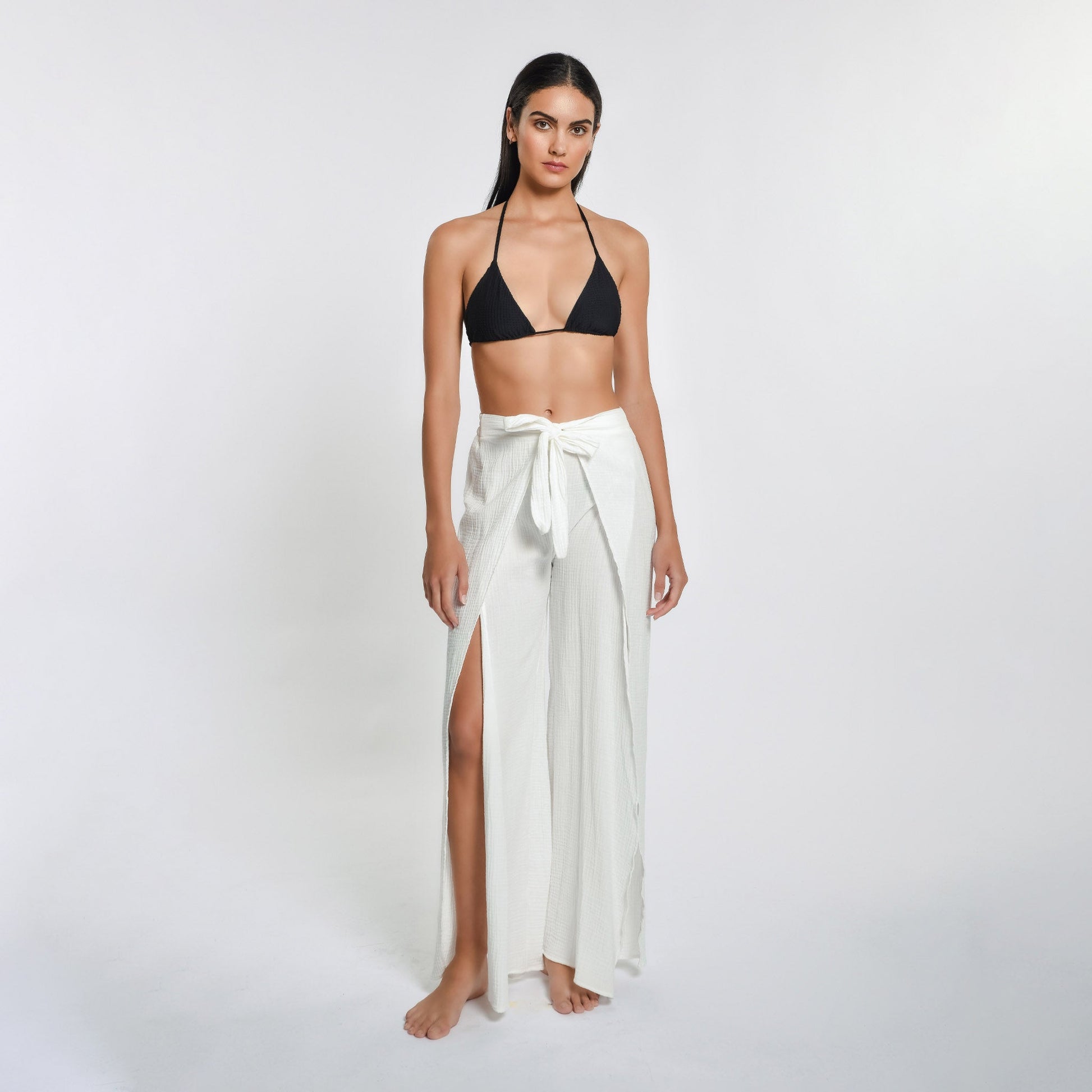 Elastic waistband, Adjustable tie at front, Slits at pants front