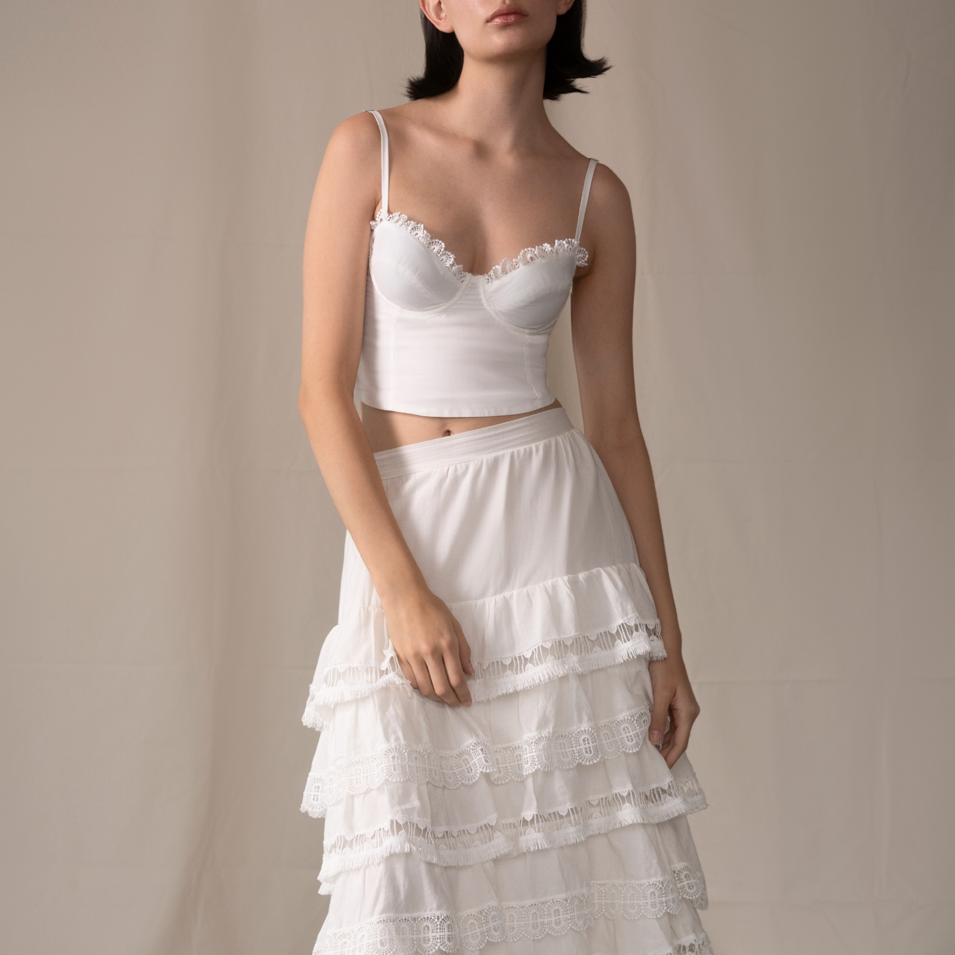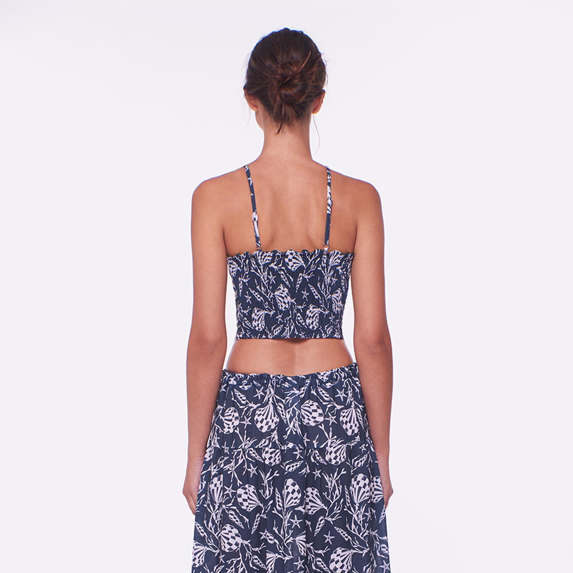 Adjustable straps, Smocked at back, Underwire, Ruffled trim, Cropped